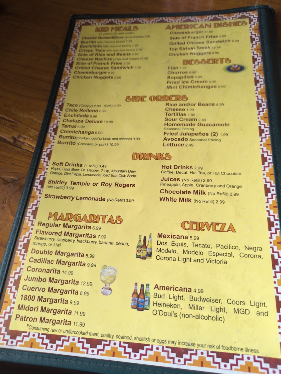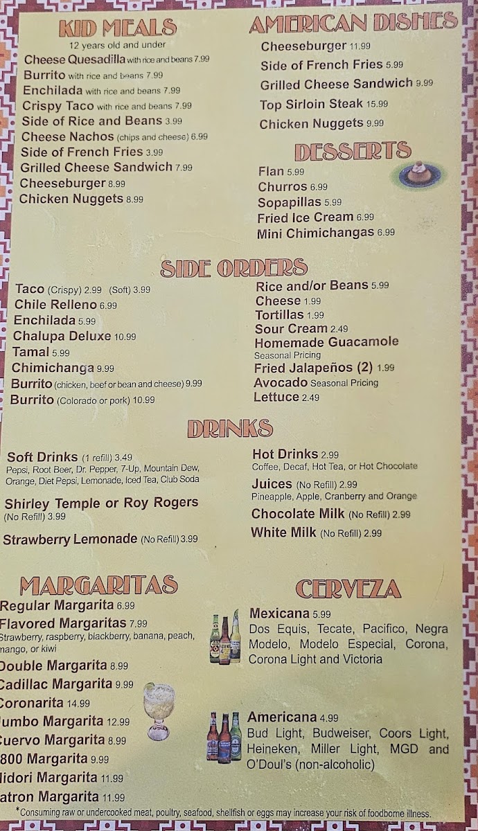 Typical choices include hearty options such as the Crab Enchiladas or Chicken Flautas, fitting for those seeking satisfying and familiar flavors. The drink menu complements the food with a range of juices, refreshing margaritas, and comforting non-alcoholic choices like strawberry lemonade or milk, which together match the easy-going, family-friendly atmosphere of the restaurant.